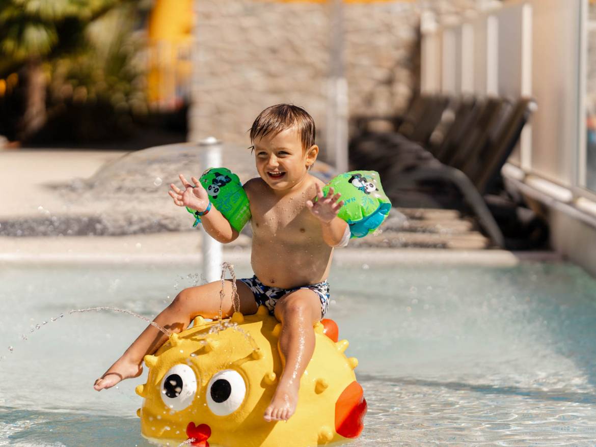 Pour les bambins, tout est prévu ! Une pataugeoire avec des jeux aquatiques se situe juste à côté de la piscine. Vous pouvez ainsi surveiller vos enfants tout en profitant du soleil confortablement installé sur les transats !